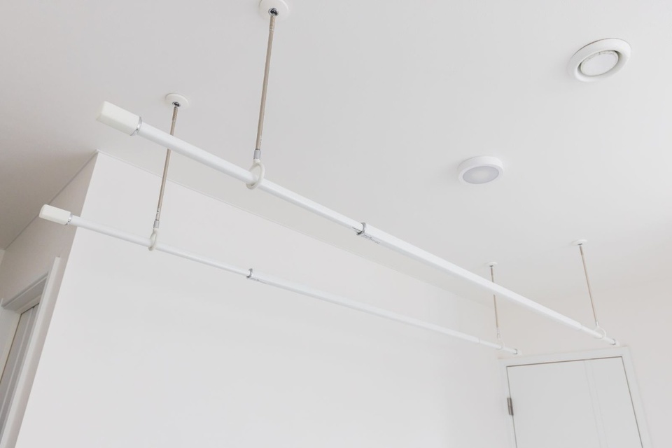 プライベートスペースである2階のホールには、空間に溶け込む脱着式の物干し竿も。家族が多くてもたっぷり干せるため、洗濯物が溜まりません。