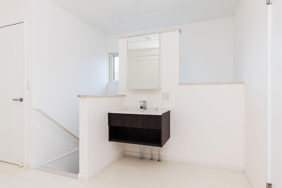2階のホールに設置された洗面所。4人のお子さんが成長した未来を見据えて子ども部屋の前に作りました。
