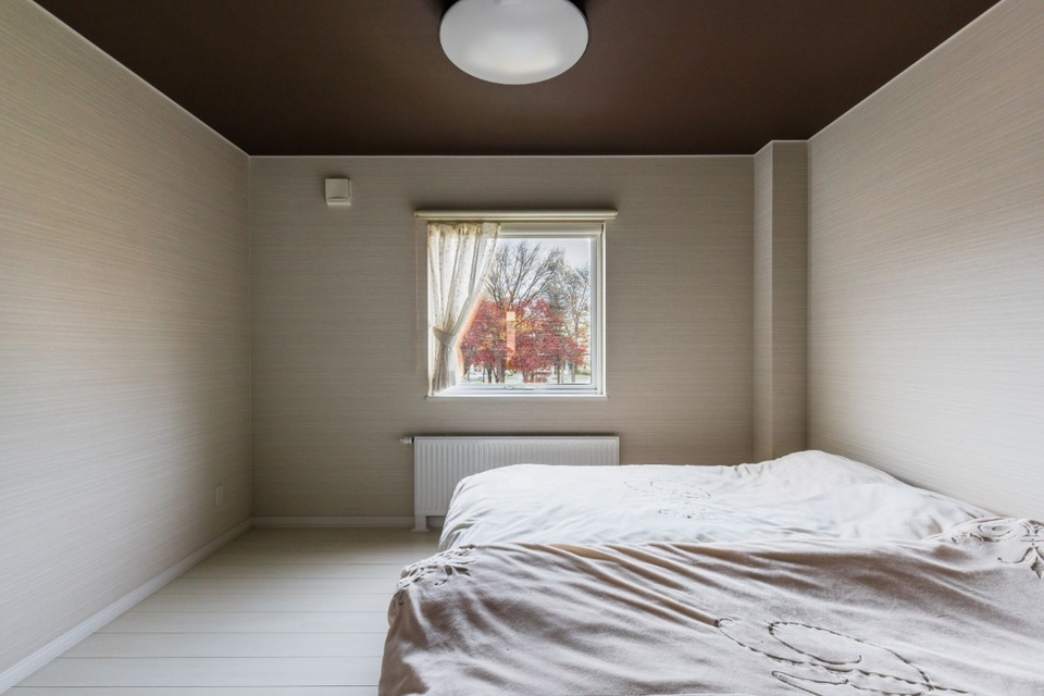 ご夫婦の寝室はブラウンの天井で落ち着いた仕上がり。ベッド以外の家具を置かず、シンプルで上質感ある空間になっています。