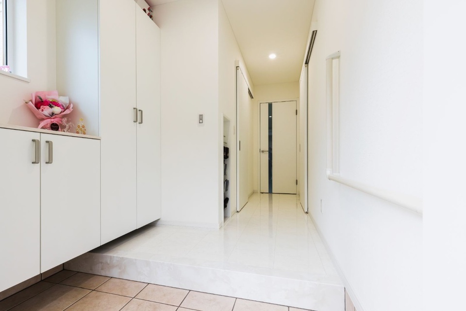 Uさんファミリーはご夫婦と4人のお子さんの6人家族です。玄関に入るとすぐに目に入るのが白く光沢のある大理石調の床材。高級感があり明るい印象です。