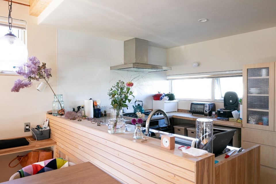 既製品のキッチンに、ダイニング側を板張りのカウンター、そしてL型キッチンに合わせて背面収納を製作し、広々としたキッチンに。キッチン横には保冷庫のあるパントリーも配置、整理整頓に活躍しています。マイホームプランに書かれていた