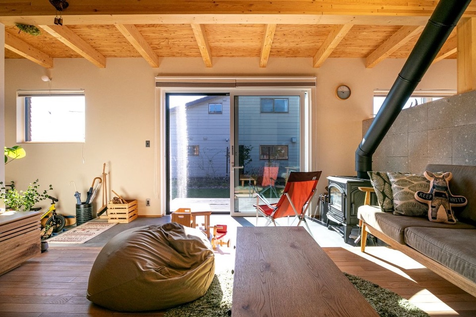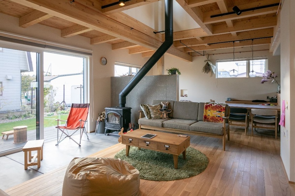 キャンプやアウトドアが好きなので、薪ストーブを土間においてもらいました。灯油セントラルヒーティングで暖房設備しているので、それでも暖房できますが、真冬は、朝起きて薪ストーブを焚くのが楽しいですね。