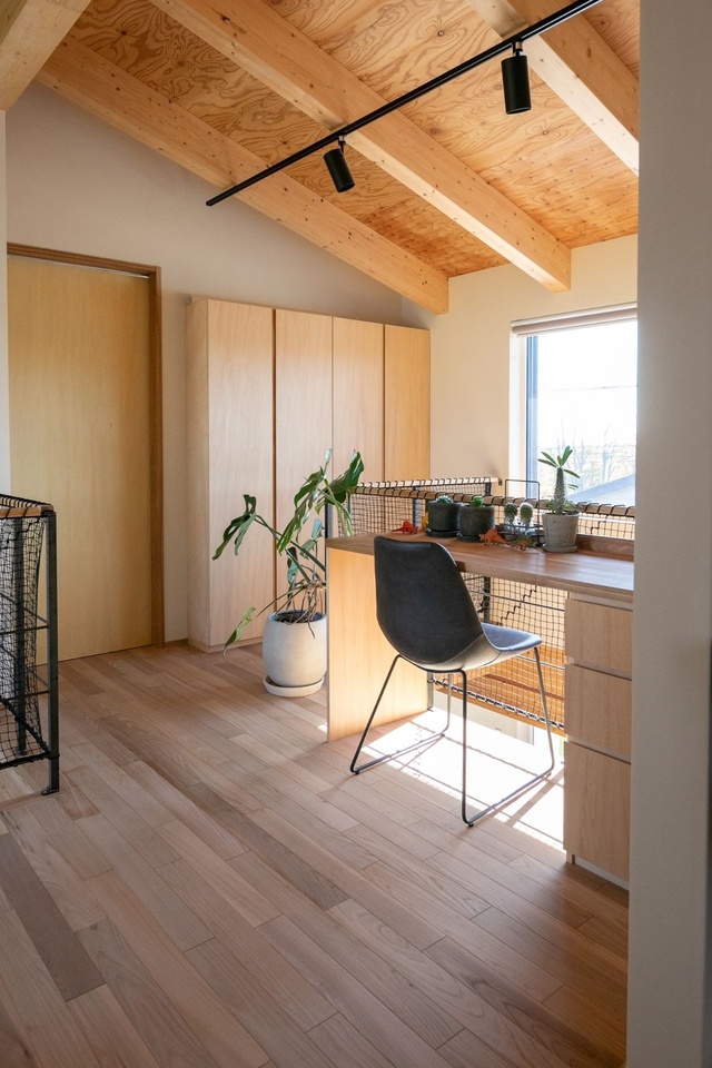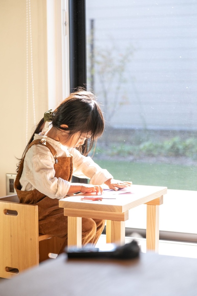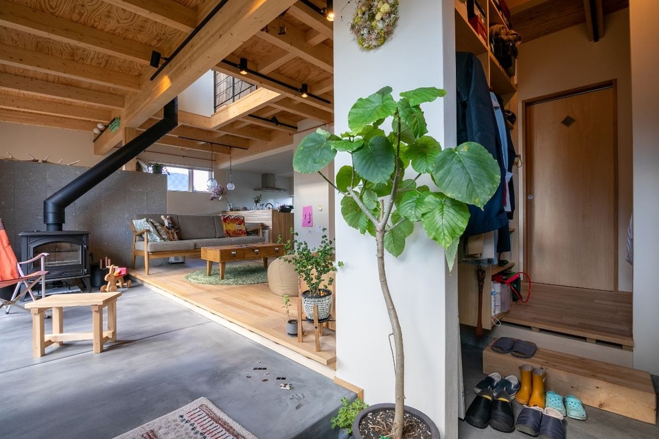 土間は子どもはもちろん大人もそこを素足で歩いてリビングのように使っています。2019年12月に住み始め、高断熱高気密で窓もトリプルサッシを使っているのでとても暖かく光熱費も大変安くて助かっています。要望をたくさん実現できた家づくりはとても満足しています。