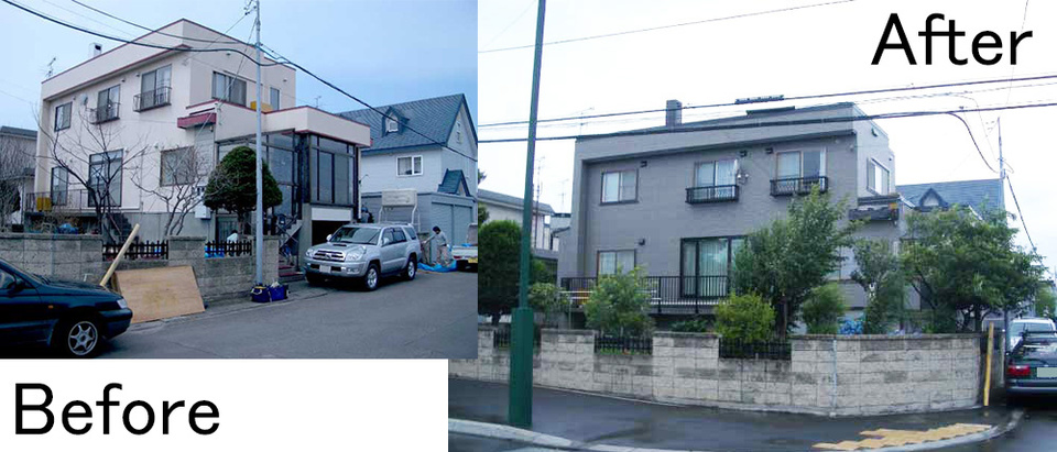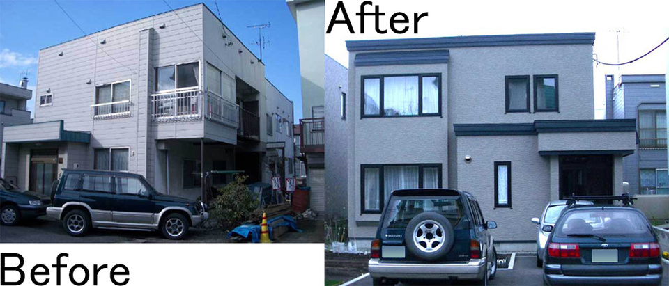 築28年の共同住宅を個人住宅に減築した事例です。手前がオーナー宅、棟続きの奥が共同住宅になっていましたが、手前の住宅部分だけを慎重に切り離して解体撤去し、奥の共同住宅を戸建て住宅として改造しました。