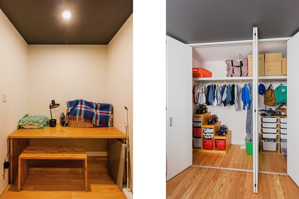 右)キッチンの隣の扉から入れる子ども部屋。クローゼットとおもちゃなどを入れられる収納が一体になっており、部屋がすっきりと見えます。