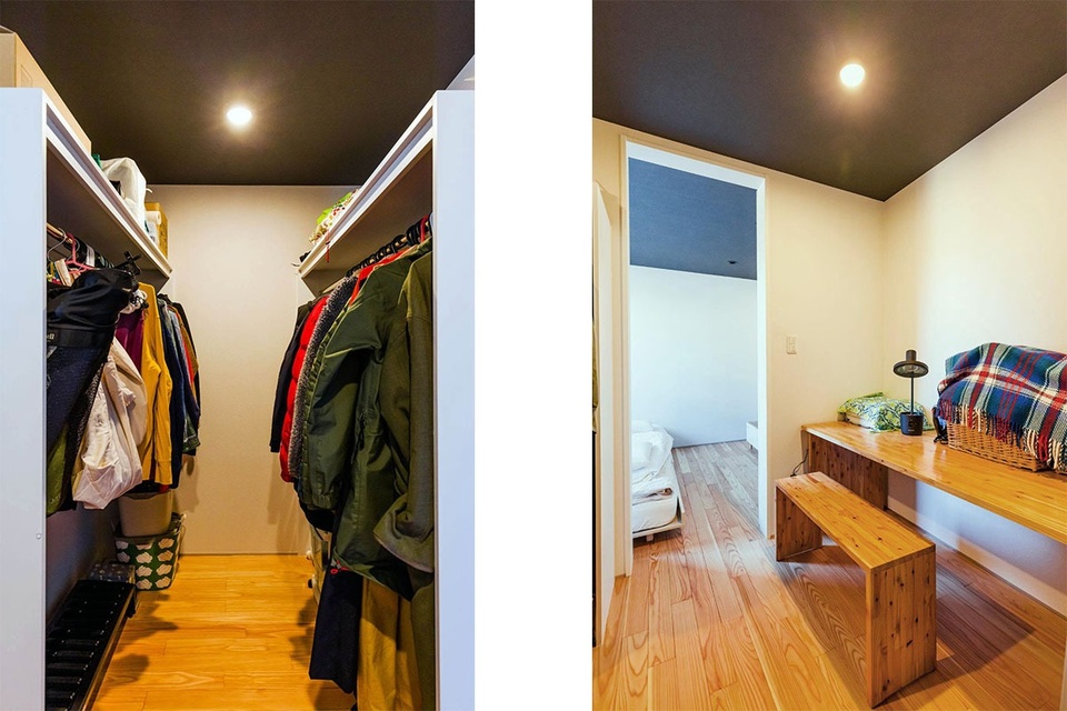 廊下は作らず、寝室の手前のスペースはウォークインクローゼットと書斎+アイロンスペースに。収納スペースは決して大きくありませんが、選び抜いたものだけを持つというライフスタイルにマッチしています。