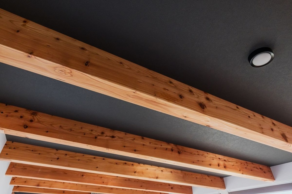 木造在来工法特有の梁。温かみのある木目が美しく、空間の奥行きも感じさせます。
