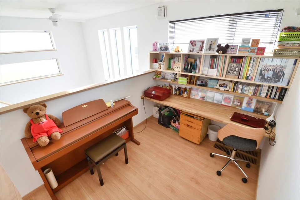 個室がある2階には吹き抜けとつながったホールが。「娘の希望で勉強机のようなカウンターと棚を造ってもらいました」。新型コロナ感染拡大によりリモートワークが定着しつつある今こそ、おうちの中にこんなスペースがあると便利ですね。