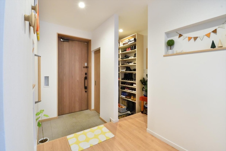 玄関には「靴を置きっ放しにしたくない」というSさんの希望により室内に出入りできるシューズクロークを設置しました。お客さまの目に触れさせたくない物もこの中に。