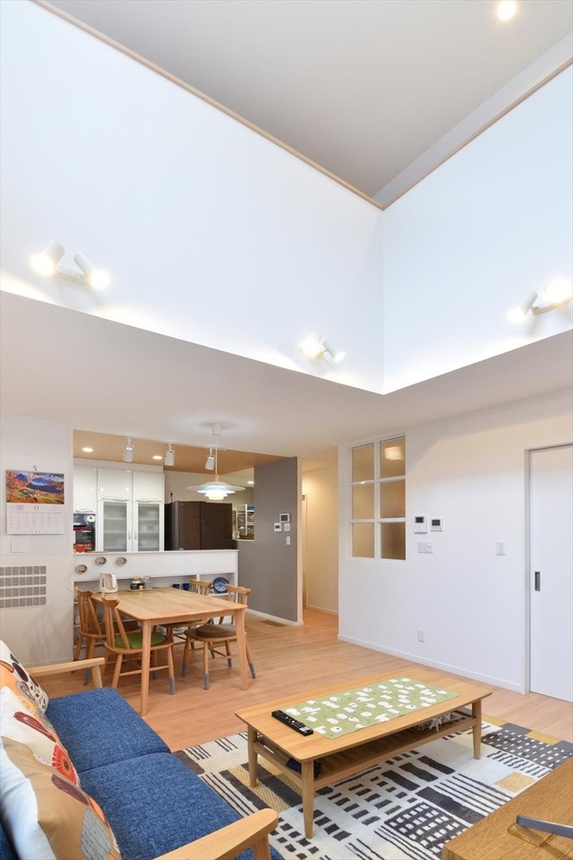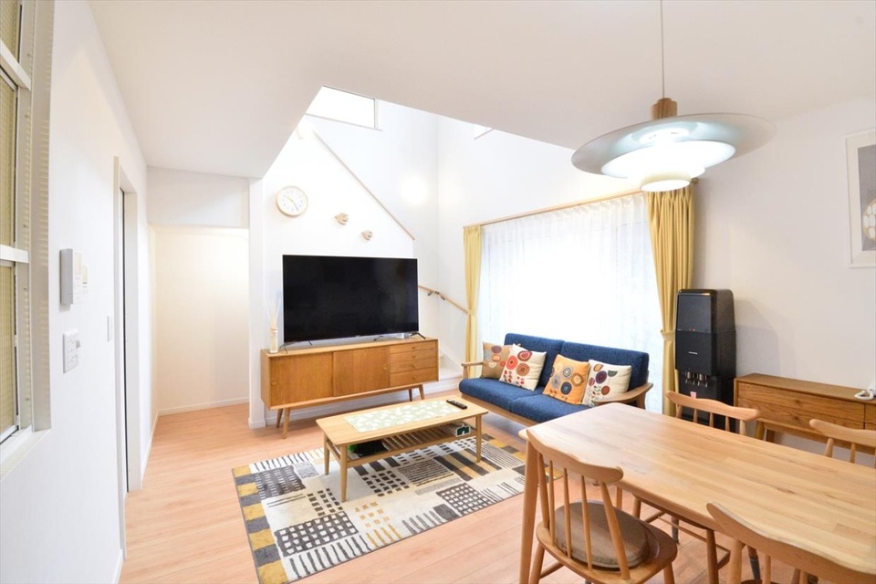 1階リビングは、ダイニングとキッチンが一続きになったオープンスペースへと大きく変わりました。右手前の白い扉の奥にはお母さまのための洋室を配置。フローリングは以前より明るめの色に。ナチュラルで暖かな雰囲気の家具や小物はSさんのセレクトです。