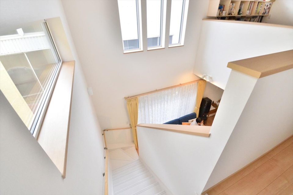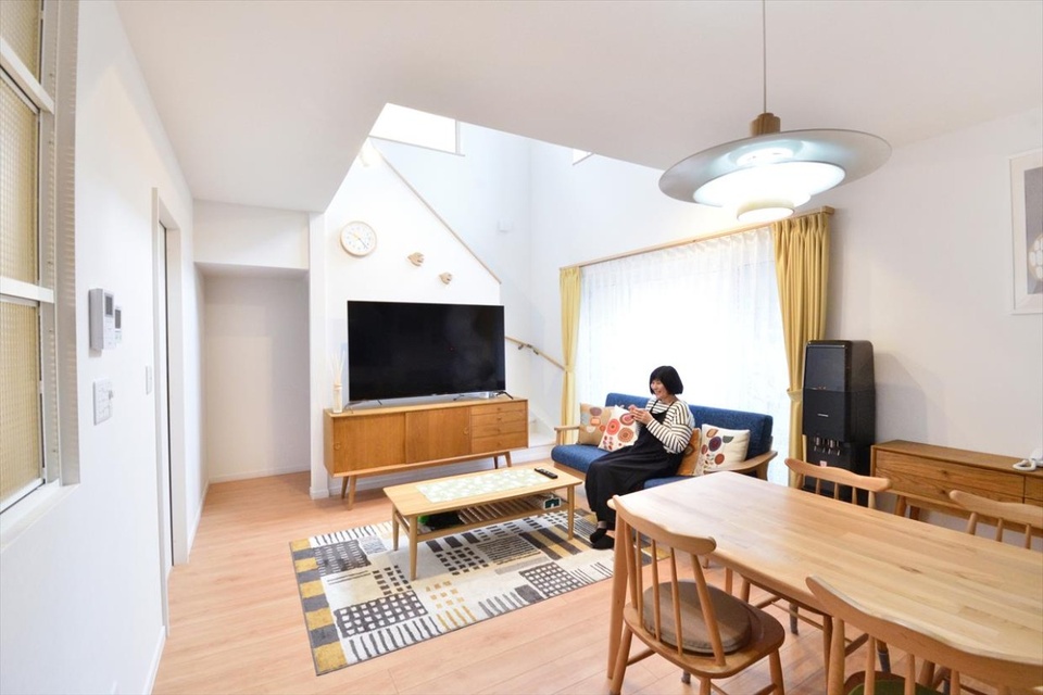 リビングの階段上部は吹き抜け構造に。床下の暖房機で暖めた空気が建物全体に循環しやすくなる効果もあります。取材日は鉛色の空で、小雨がちらついていましたが、リビングには明かりも差していました。「今までのリビングとは比較にならない明るさで、気持ちがぜんぜん違います」とSさま。