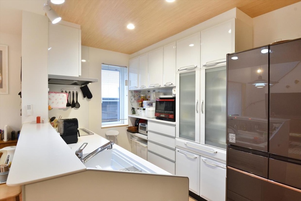 天井に木目調のクロスを部分貼りしたシンプルなキッチン。前よりもユーティリティに近くなり、お料理とお洗濯の同時進行が楽になりました。