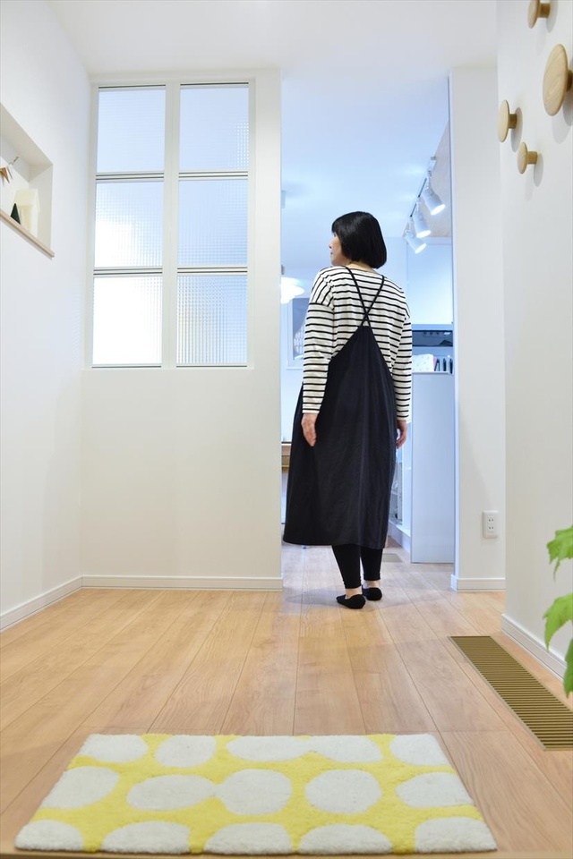 玄関ホールからリビングにつながる動線。ガラス入りのパーテーションはインテリア性も高く、程よい幅で間仕切りと目隠しの効果を発揮。