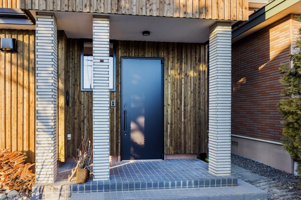 リノベーションといっても見た目は新築同然です。玄関ポーチの柱とタイルは改修前の家のものを利用、家の歴史を引き継ぐと同時にヴィンテージ感も醸し出しています。もちろん費用も抑えました。