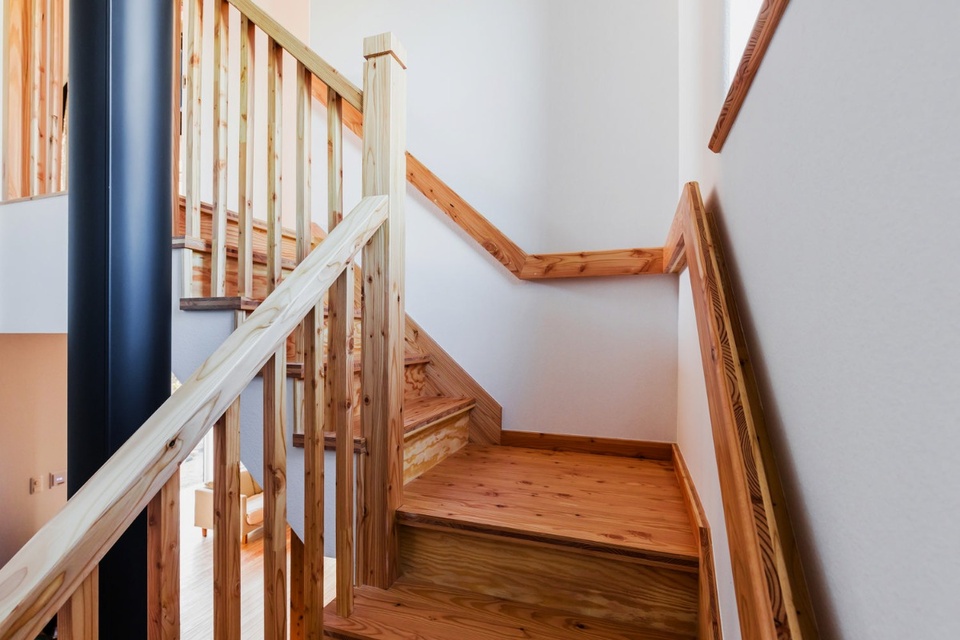 2階へ続く階段は手摺もカラマツで作成しました。握るとさらりと柔らかな感触です。シンプルな内装ですが、確かな上質感があります。
