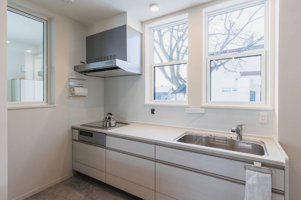 キッチンは、お手入れのしやすいシンプルなものを選びました。窓からは「辛夷(こぶし)庵」の由来となった大きなコブシの木を見ることができます。