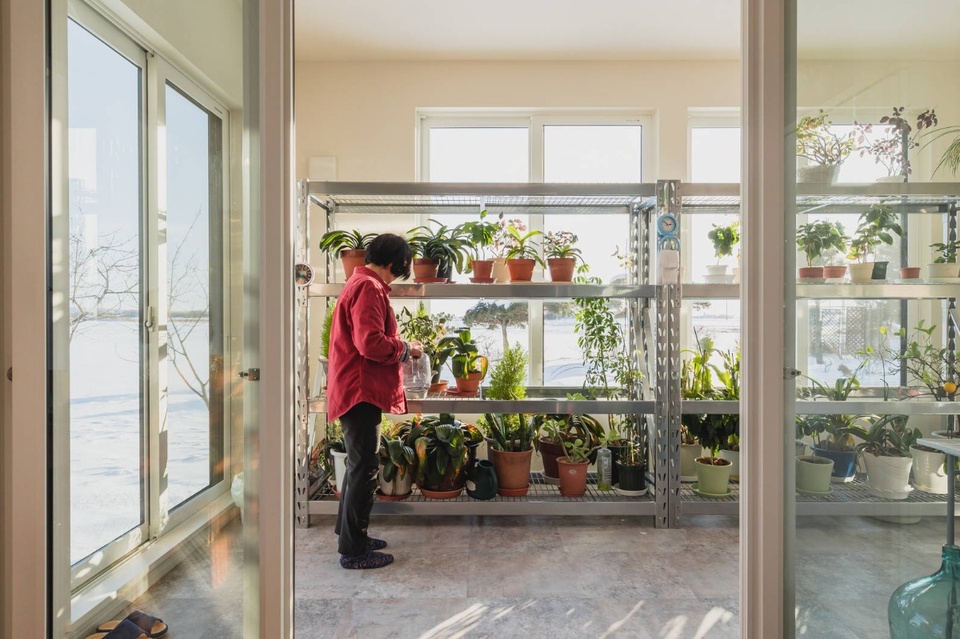サンルームで植物のお世話をしているのは、農業のかたわら英会話講師としても活躍している奥様の真幸子さん。温室には明るい日差しが差し込み、暖房を切っていてもあたたか
