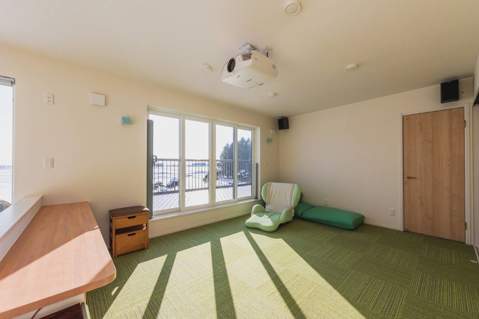 「みんなの家だから、壁一面に大きく映して映画会なんかをしても面白いよね」と、フリースペースはホームシアターも兼ねた空間に。プロジェクターを設置し、スクリーン用の壁紙を使用しました。