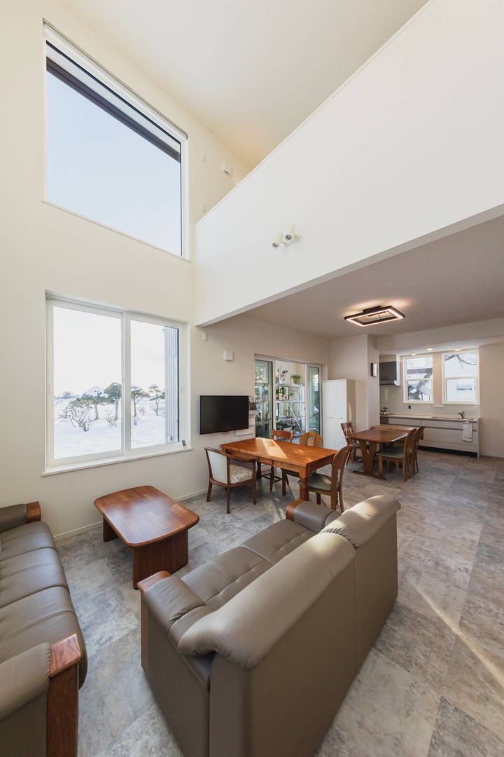 さて、扉を開けるとそこは広々としたLDK。大人数がリラックスして会話を楽しめる造りになっています。ゆくゆくは土足で気軽に入れるようにして、応接室のように使いたいと考えているそうです。