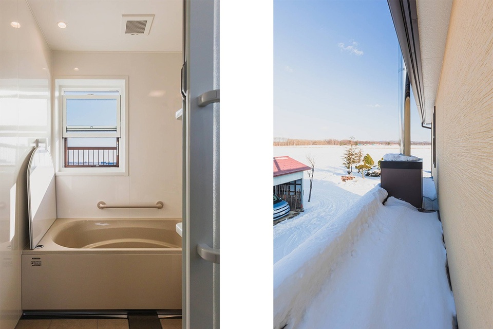写真右はウッドボイラーの煙突のメンテナンスに使える屋根上の通路です。写真左は遠くへと続く景色を眺めながら入れるお風呂。90代のお母様にも「温泉に来たみたい」と喜ばれているそうです。