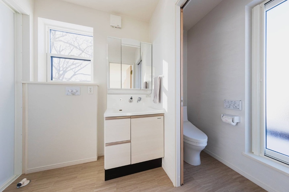 2階の洗面・お手洗い部分。お手洗いの窓から屋根の上に出ることができます。