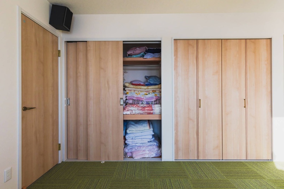 内装は主に真幸子さんが選びました。フリースペースのじゅうたんは窓から見える風景に合わせ、青々と伸びる小麦の色に。収納には寝具がたっぷり入り、来客が多くても安心です。