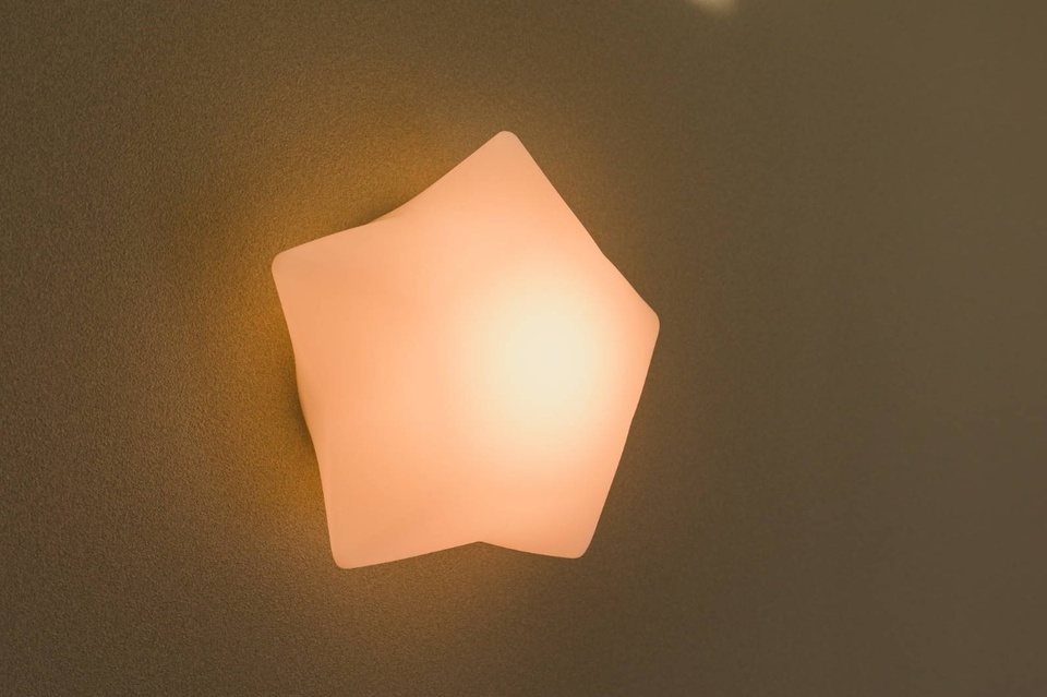 壁紙の下にはタイガーハイクリンボードという石膏ボードを使用。ホルムアルデヒドを吸収・分解する機能があり健康面も安心です。赤坂建設ではこちらの石膏ボードを標準採用しています。やわらかな星型の照明もあたたかな印象です。