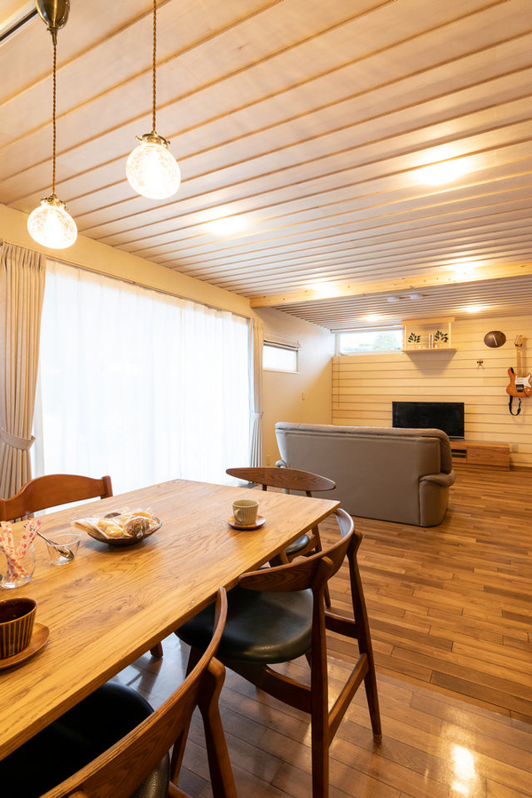 リビング・ダイニングの天井は下見板張り。夜はダウンライトの反射により陰影が生まれ、素敵な雰囲気を醸し出すそうです。下見板を採用した理由を一原さんにうかがいました。「トップランナーというハイスペックな住宅でありつつ、木の良さをどこかに出していきたいと考えました。最終的に、下見板を内装材として天井に張って、木の持つ温かみや質感を表現しようと決めたのです」