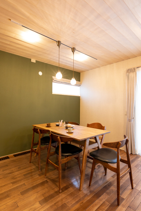 ダイニングとキッチンの壁はダークグリーン。1階のフローリングは、ナラの無垢材に塗装したもの。「このダイニングの椅子に座って見るリビングや小上がりの雰囲気が、特に気に入っています。とても落ち着きますね」とTさん。「私も一番好きなのが、リビングと小上がりの雰囲気です」と奥さま。