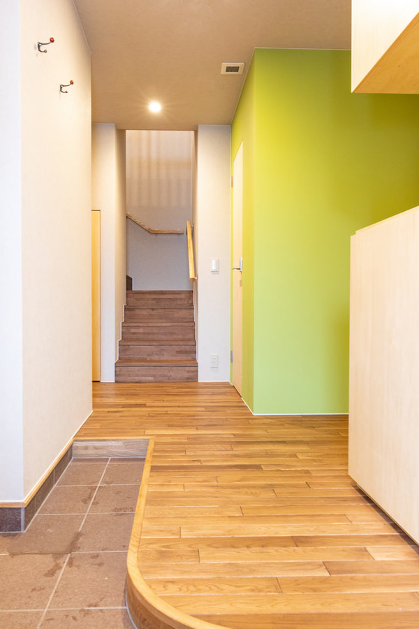 アール形状の広い玄関ホール。フレッシュグリーンの壁部分はパントリーです。