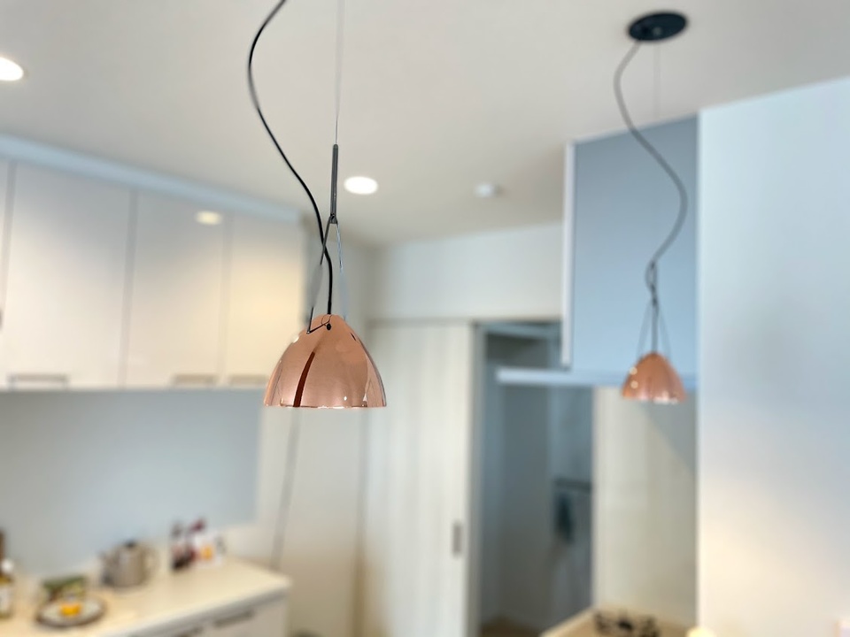 キッチンの手元灯にはカッパー(銅)色の金属製ペンダントライトをつけました。