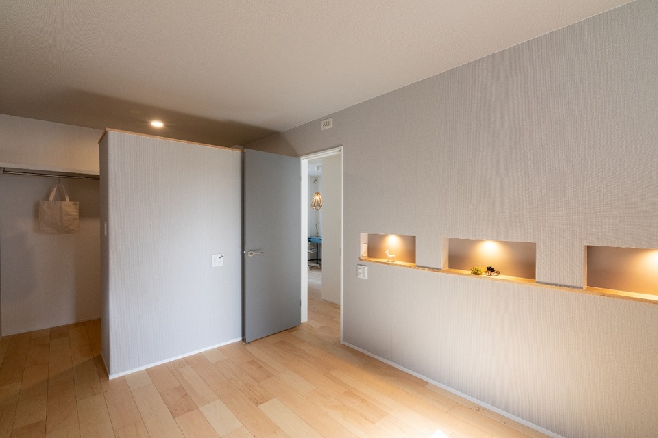 主寝室はペールグレーの壁紙に、ダウンライト付きの3連ニッチでムーディーな空間になりました。