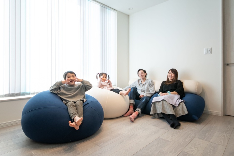 人気のビーズソファ「Yogibo(ヨギボー)」でくつろぐご家族。暖房パネルを使いたくなかったというZさん邸では、輻射熱でじんわりと室内が温まる独自の遠赤外線床暖房を採用しました。ご主人は「床にゴロンとして過ごすのも気持ちいいですよ」と話します。