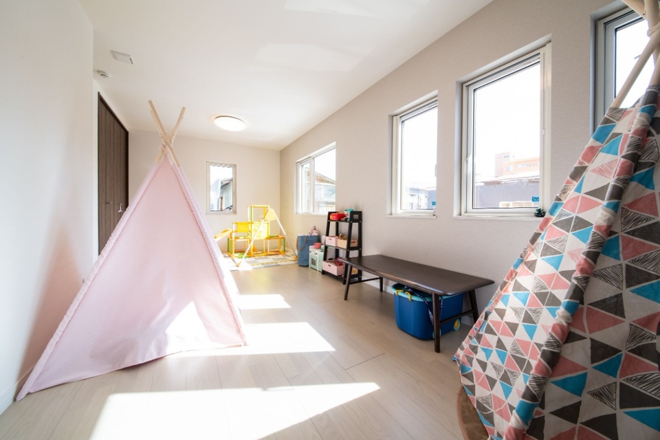 将来は2つの個室に分けられるようにしていますが、今は広々と遊べるスペースとしてオープンに使用。なるべく明るい家にしたいという要望で、子ども部屋にも窓を多めにつけています。