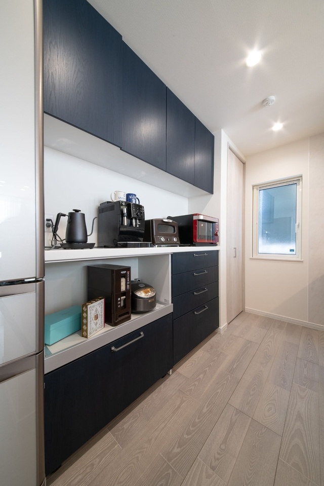 カップボードの隣には、ご夫妻の希望で食品庫も設けました。買い置きしたものをたっぷりと保存できるので、とても重宝しているとか。