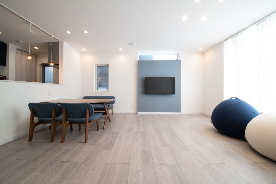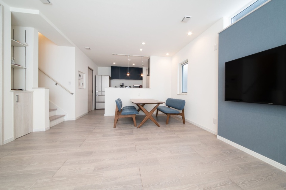 「室内はあまりモノを置かず、すっきりとした空間にしたい」と要望したご夫妻。リビングルームはホワイト系の壁クロスと淡い色合いの木調フローリングで開放的に、ネイビーカラーのアクセントクロスが空間を引き締めています。