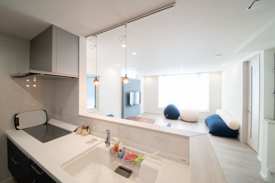 家事をしながら、お子さんたちの様子を見渡せるキッチン。カウンター前面には少し立ち上がりをつけて、手元が見えないようにしています。2階へは、玄関からリビングに入って、ほぼ横手にある階段を上るようになっているので、「おかえりなさい」の声も掛けやすい動線です。