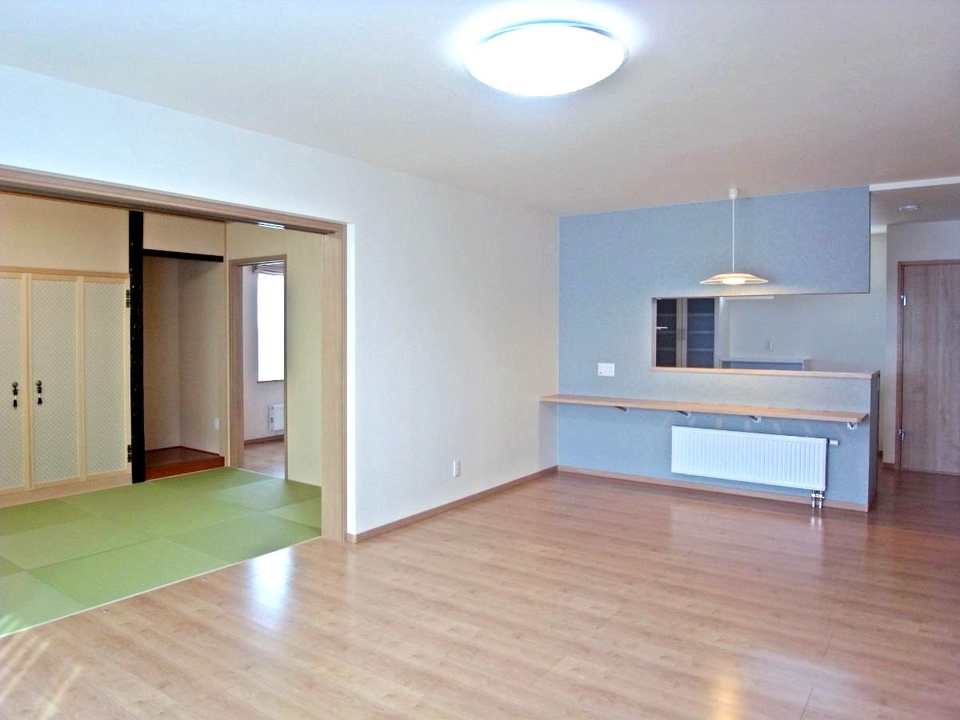 1階親世帯のLDK。リビングには隣接する和室があります。明るい床色と畳の若草色でさわやかな印象です。