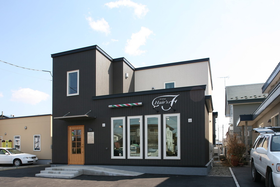 帯広市内の大きな通りに面した理美容室、へアーズfさま。ご主人は札幌で修業し、地元に戻って開店するのを機に、店舗兼住宅の新築を考えておられました。赤坂建設は土地探しからお手伝いさせていただきました。