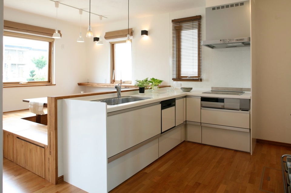 キッチンは小上がりに向かって設置。L字型の使いやすいデザインです。