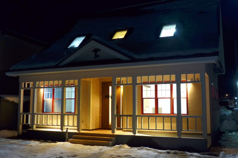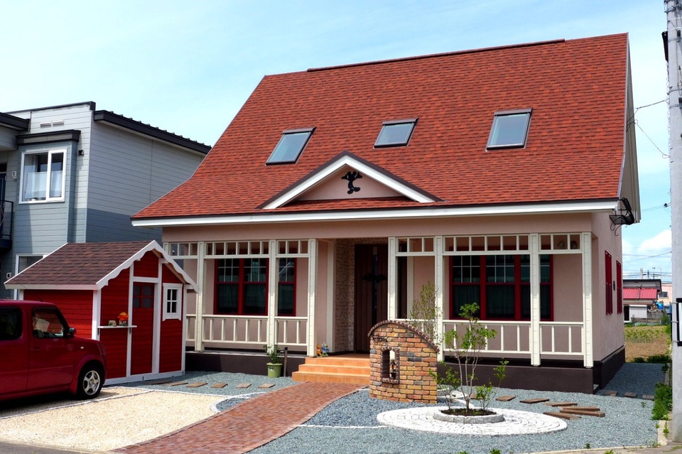 帯広のSさまのお宅はカバードポーチに赤のシングル屋根がおしゃれな洋風住宅。ポーチは赤坂建設が無垢のツーバイフォー材を使ってつくったオリジナルです。