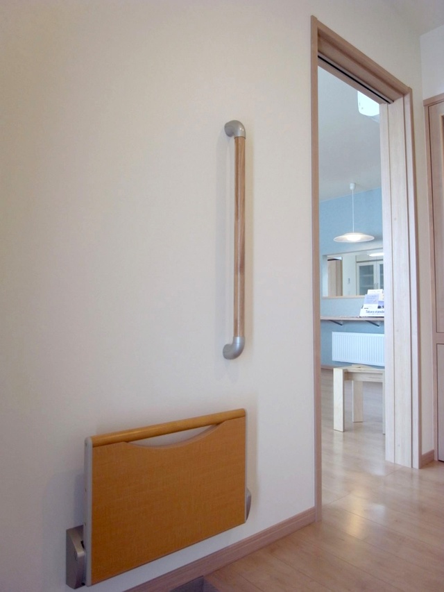親世帯の玄関には、折り畳み式のベンチも。靴の脱ぎ履きや荷物のちょっと置きにも便利です。