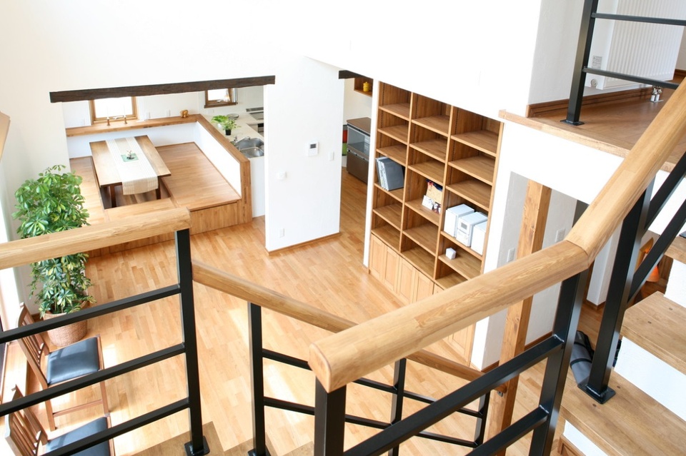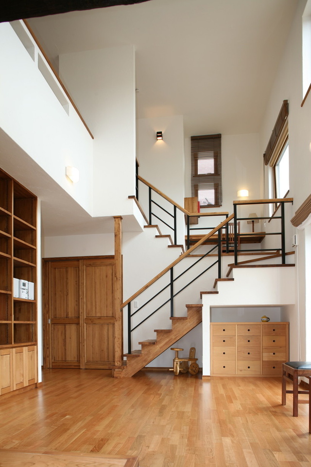 右/上部は2階ホールとつながっています。三角屋根の天窓も良い雰囲気です。