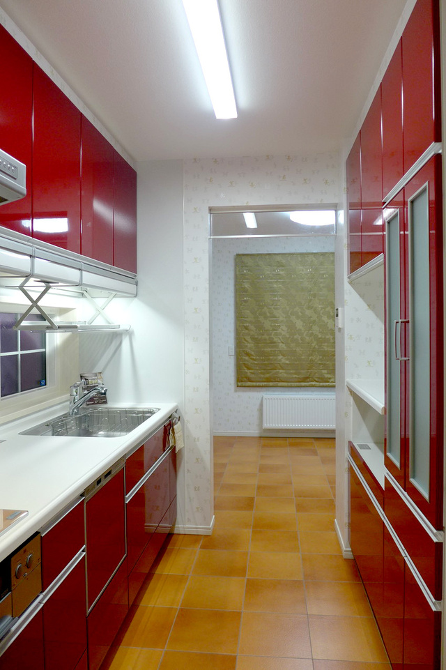 キッチンも赤で統一しています。収納もたっぷりと備えています。
