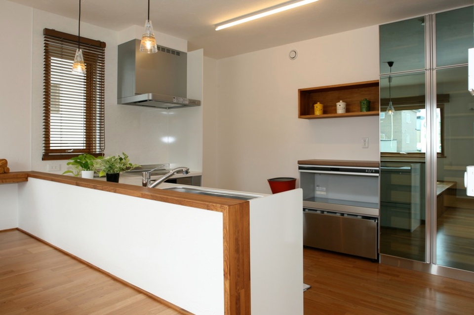 小上がりにいる家族との会話も弾み、配膳や片づけもしやすいキッチン。背面収納はガラス仕上げの食器収納や見せる棚収納で、スタイリッシュに仕上がりました。