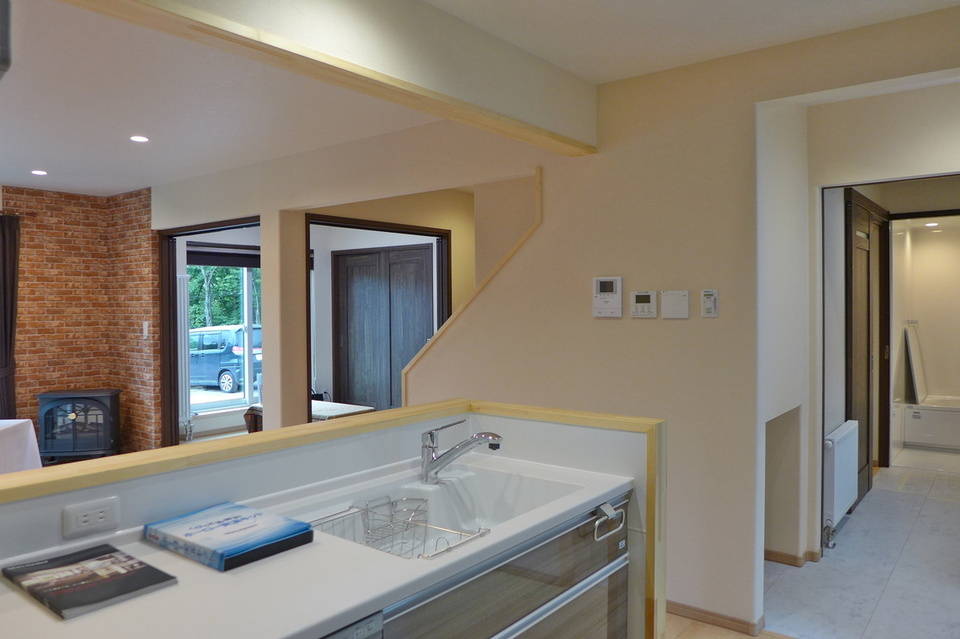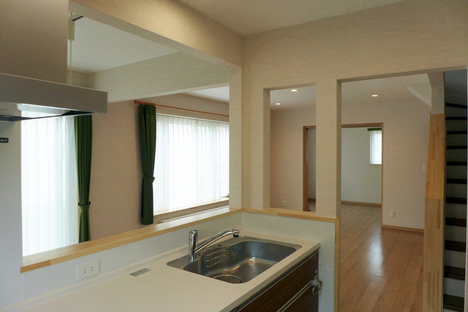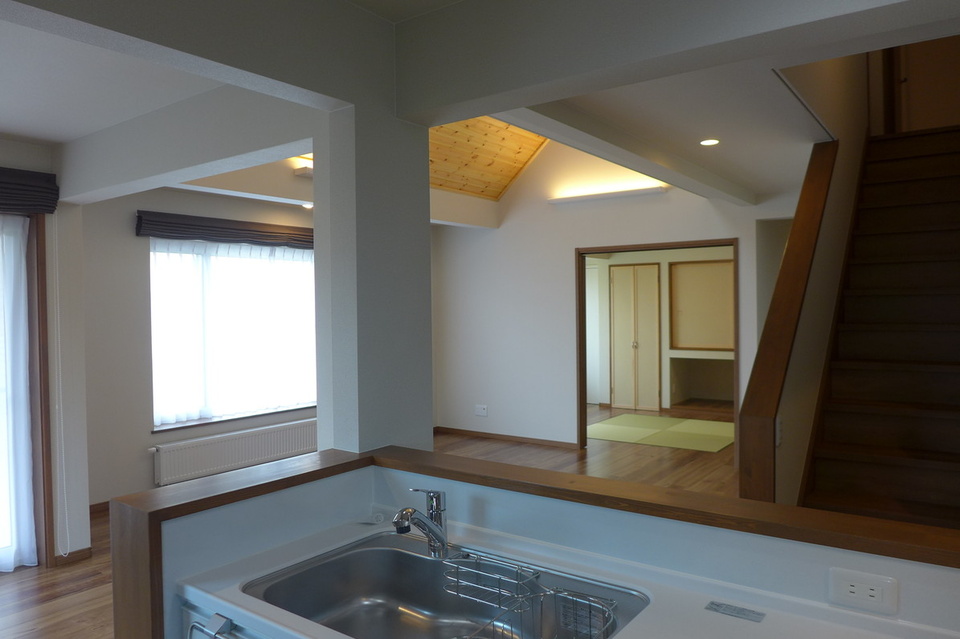 キッチンから見た眺め。リビングや隣接する和室、階段を行き来する家族の様子が見守れます。