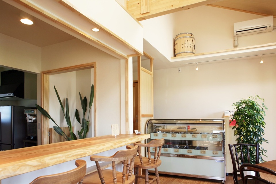 ナチュラルな雰囲気に仕上がった店内には、4人が座れるカウンター席と2人掛けのテーブル席が2つあります。間接照明やダウンライトで、ナチュラルな中にも喫茶店ならではの寛ぎを演出しました。