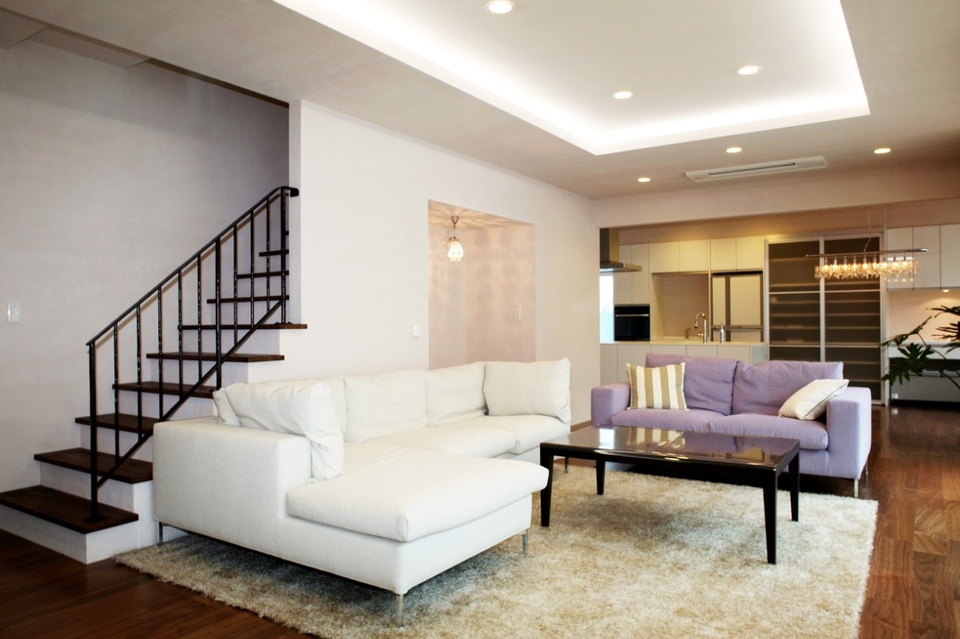 リビングはフレンチモダンを連想させるスタイリッシュな空間に。折上げ天井にダウンライトや間接照明を施したラグジュアリー感を演出しました。