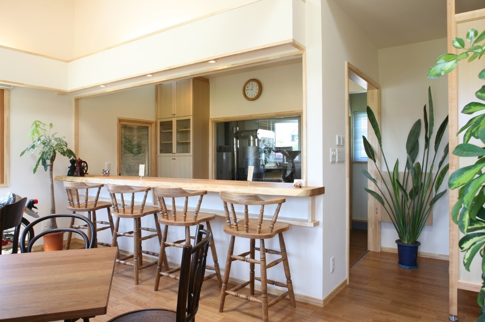 ダイニングスペースには便利なカウンターを造作しました。キッチンとは横並びで、作業動線も良い間取りです。
