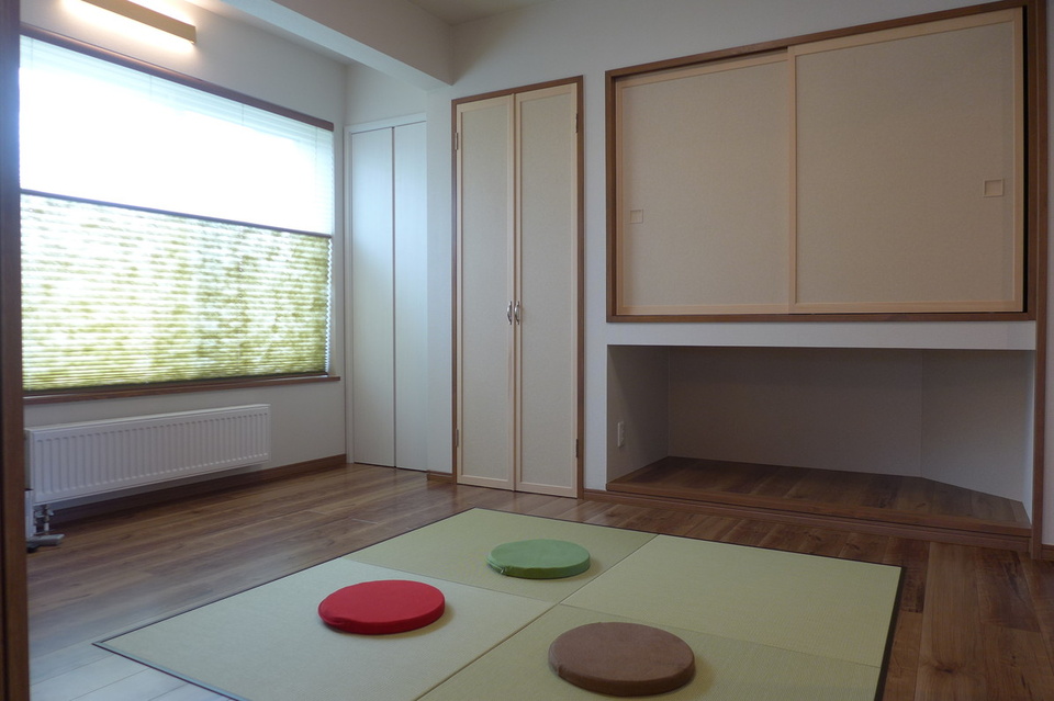 フラットな置き畳を敷いたモダンな和室。来客用として、将来は寝室としてなど、重宝しそうです。